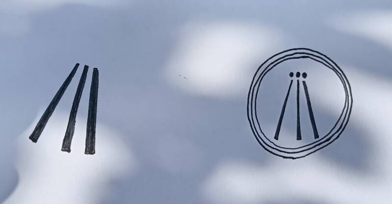 Photo below: two versions, older version on left, the newer on right, of the Welsh awen symbol. This possibly-ancient Welsh symbol is used in Modern Druidism and was used by its founders to signify the awen, the poetic or magical force that permeates all life and creation, and is also the bard or druid's source of poetic wisdom. I refer to the awen in various places and have included a completely separate example of another example of this symbol in an unrelated book published last year. On this website, I refer to the awen in the poem titled: The stars over Y Berwyn, on the page titled: p1. First page of poems in English, available from the following URL: https://www.clwaideac-na-cuinne.co.uk/poetry-pages-includes-pages-for-poems-in-other-languages-p1-to-p18/p1-first-page-of-poems-in-english . The awen, like the hannunvaakuna, is I feel a symbol that invokes for me only positive and very spiritual feelings. Therefore like the hannunvaakuna I feel that I connect with this symbol in a wide way, especially as it, and its shape, bare similarity to other symbols of a similar nature. From what I understand of this symbol, the three lines represent the spiritual radiance of energy and life from the creator or from creation. It may also be interpreted by some for example in terms of an upper world, middle world and lower world, as is common in many Eurasian and some other indigenous belief systems. I would not be surprised if this symbol had an equivalent in the Americas, in some form. It shares some similarity for example to a protection symbol I included a copy of in my recently published article for Silly Linguistics, titled: On non-Norse language in Iceland, and Icelandic magical staves - a mysterious symbolic language . Could the awen symbol also represent a sound, like the "Om" sound, similarly to how one of the Icelandic staves in the aforementioned article for Silly Linguistics - as I commented in that article, resembles in some ways the "Om" symbol of Hinduism, with its symbolism of the number three? Was awen the ancient Welsh equivalent of "Om"? The art below was photographed outside in daylight after I, the author, drew it, hence the shadows for affect.